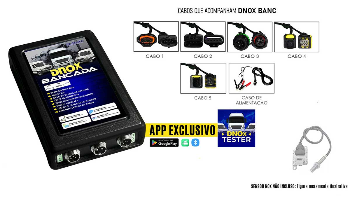 Equipamento 12V (linha leve) ou 24V (linha pesada) para diagnóstico do sistema Arla 32 e teste do sensor NOx em motores Diesel.