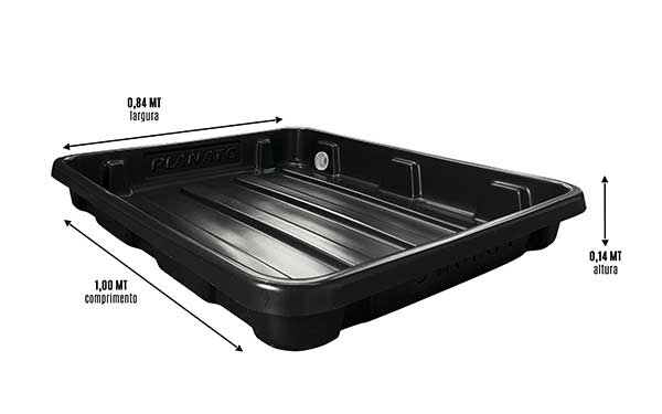 Com 1,00 m (C) x 0,84 m (L) x 0,14 m (A), possui tamanho ideal para ser posicionada sob o veÃculo, garantindo a coleta eficiente de lÃquidos e peças durante manutenções.